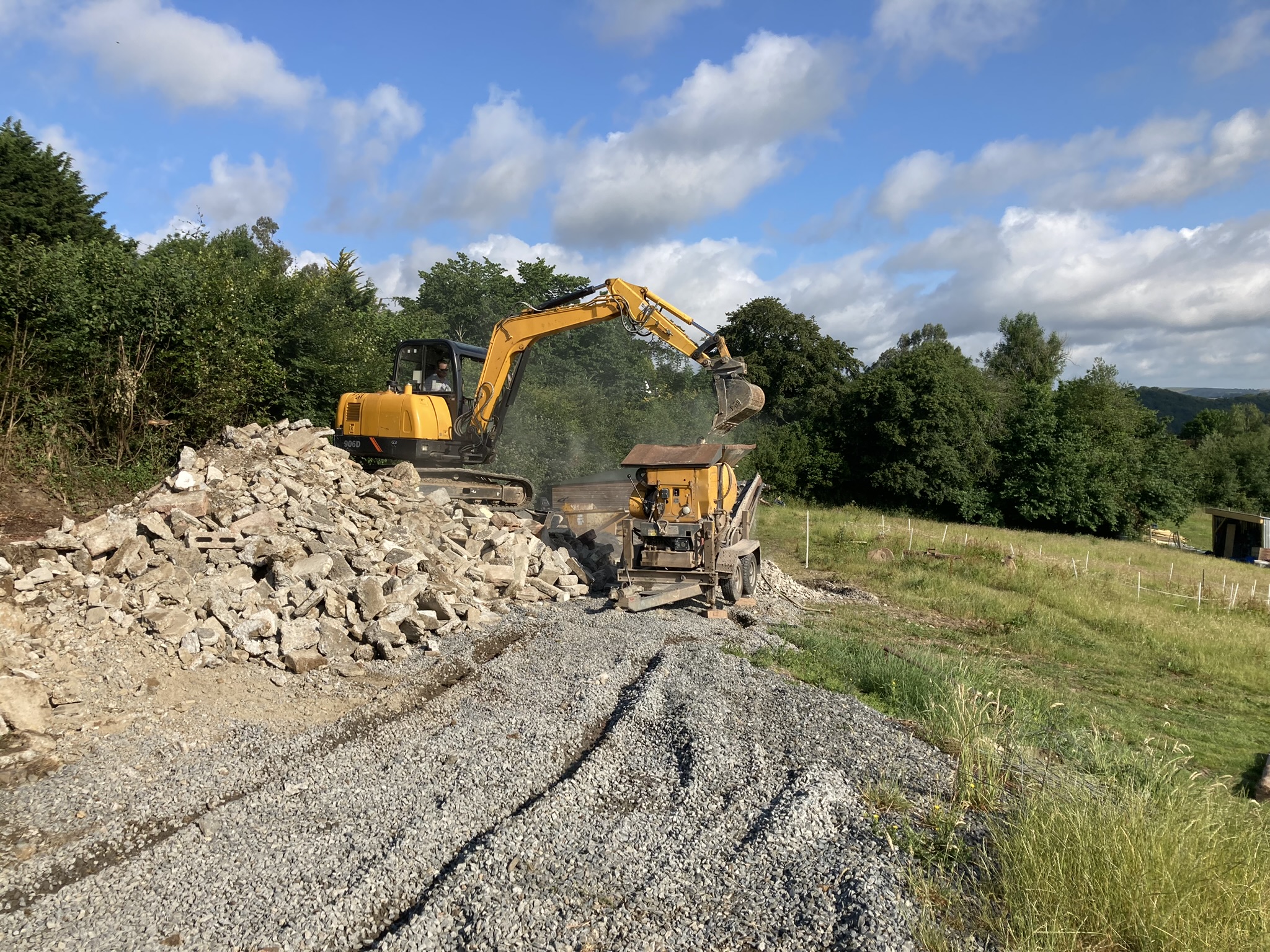 Crushing the outbuildings stone and recling for new driveway base, stables base and, if we have any left, the sub ground bearing slab layer. Thanks to Lewis from tlc plant for his crusher – based just down the road in Crediton!