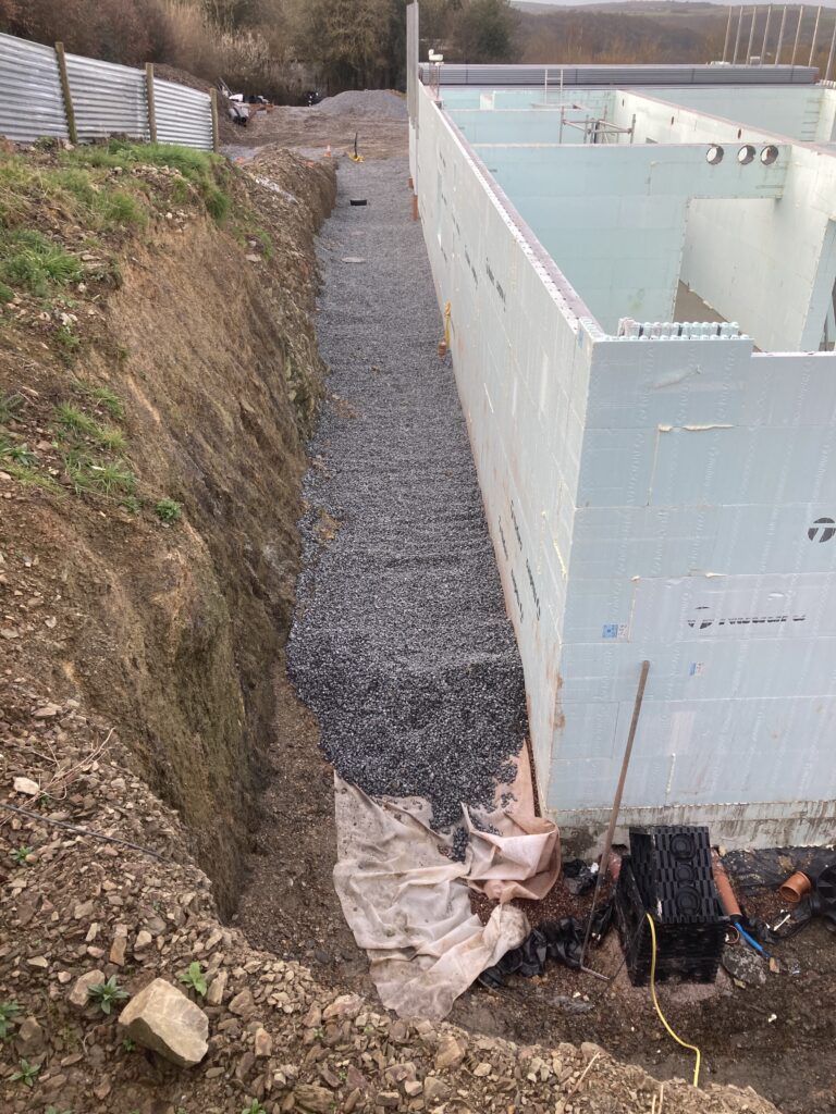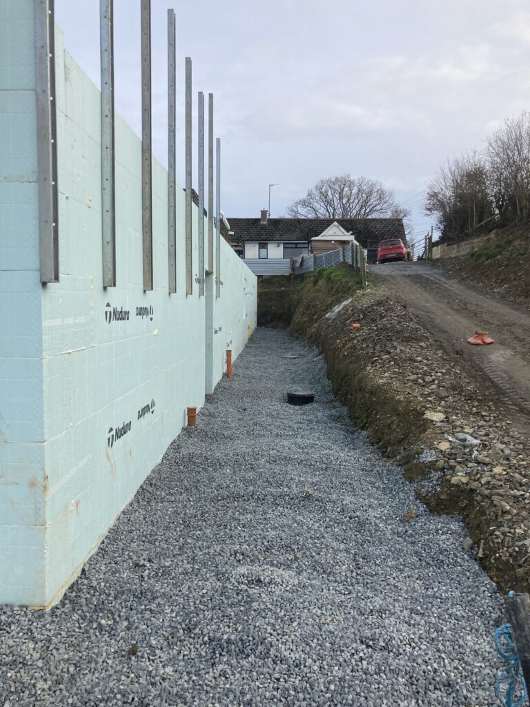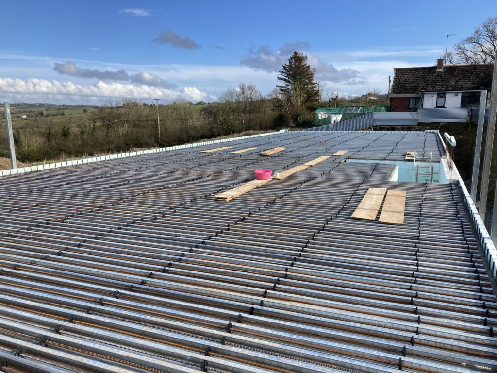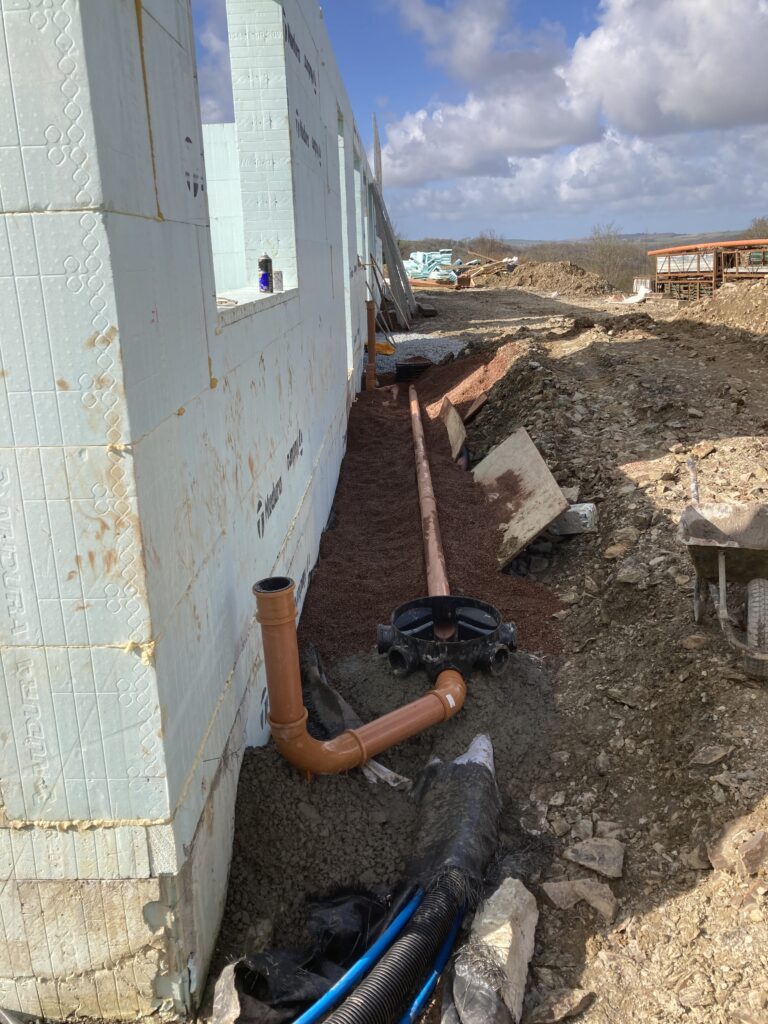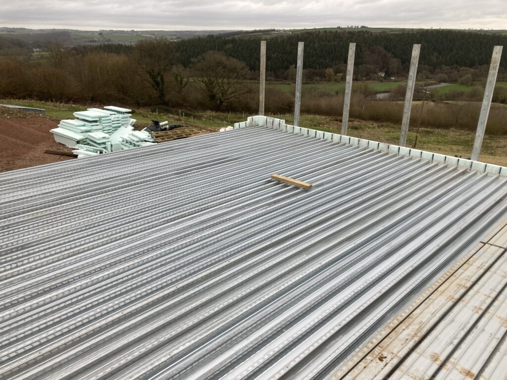 Metfloor is the permanent shuttering that supports the first floor slab – a corrugated sheet system. This is our focus this month together with finishing off the drainage…
