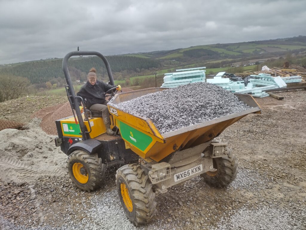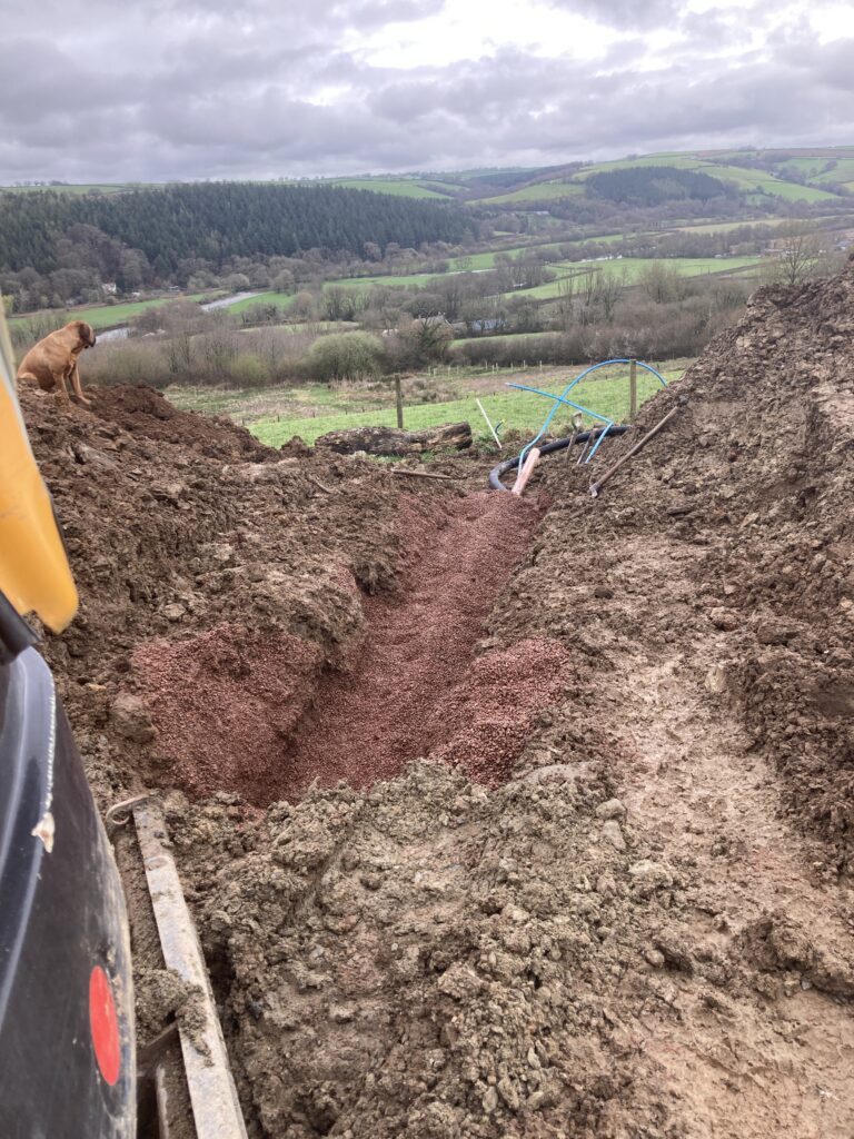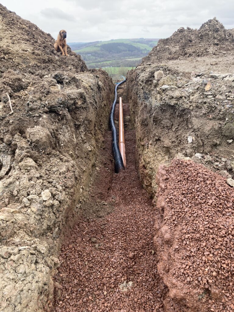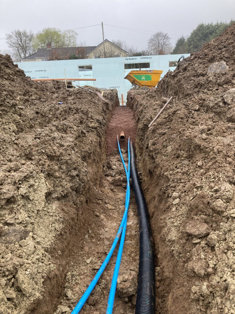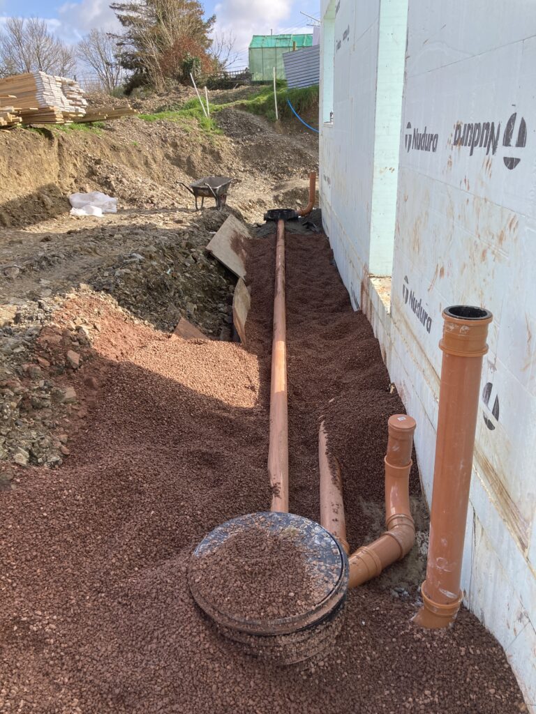 Meanwhile we’re finishing off the groundworks, bedding the new electricity supply ducting in sand before covering the land drain and soil drains with pea gravel and stone chippings on top for the pathway. Then onto the roof draiange on the other side of the house – adding additional pipework should we or anyone in the future want to recycle the rainwater.
